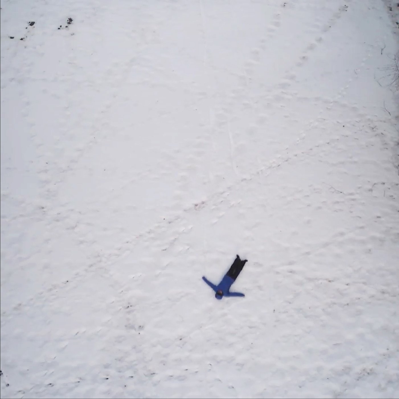 Inspiriert von Rutschtests, mit denen der mögliche Verlauf von Lawinen bestimmt wird, erforscht Piotr Urbaniec die verschneite Alpenlandschaft. Doch anstelle von Sandsäcken sind es Menschen, die talwärts gleiten. In gemeinschaftlichen Schneerutsch-Workshops werden die Besucher:innen Teil dieser wortwörtlichen Fall-Studie. Jede:r bringt durch die eigene Rutschtechnik, Haltung und Kleidung ein individuelles Verhältnis zur Schwerkraft mit. So entsteht ein vielschichtiges Bild aus Körpern, die sich über die weiße Fläche nach unten bewegen. Eine Drohne hält dieses fragile Zusammenspiel von Kontrolle und Kontrollverlust fest. Die daraus entstehende Videoinstallation zeigt eine schwebende Menschenmenge zwischen Gravitation und Leichtigkeit.