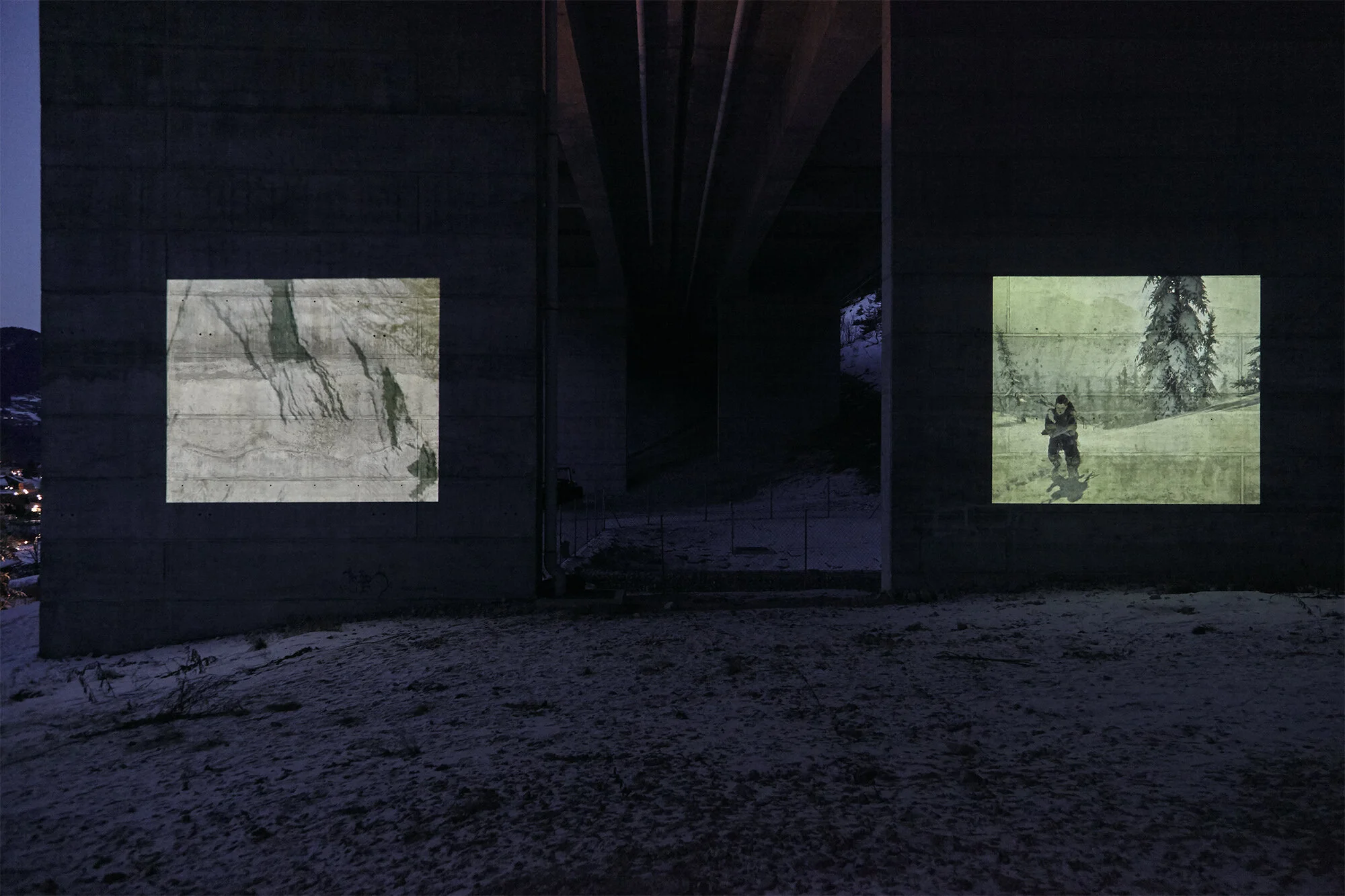 The experimental digital artwork by Esther Polak and Ivar van Bekkum tries to interlace three realities by combining video footage of three worlds: the real, the virtual and the fantasy. Video material represents the virtual world as digital copy of the real world in Google Earth, while the fantasy world is depicted by the snowy mountain ranges of the video game “Horizon Zero Dawn”.
